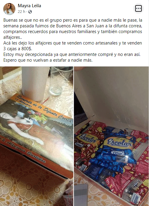 "Acá les dejo los alfajores que te venden como artesanales y te venden 3 cajas a 800$. Estoy muy decepcionada ya que anteriormente compré y no eran así. Espero que no vuelvan a estafar a nadie más", escribió en las redes y el mensaje se volvió viral.