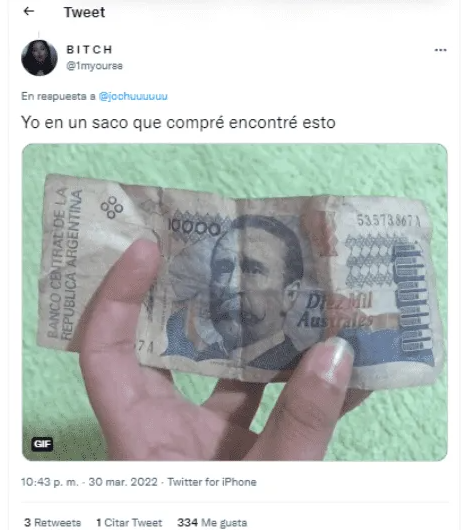 Una de las usuarias que se sumó al hilo, y al igual que Josefina, mostró con que se había topado ella, tuiteó: "Yo en un saco que compré encontré esto", acompañando la publicación con una imagen de un billete de 10.000 Australes, del Banco Central de la República Argentina. Si bien no alcanzó la repercusión que tuvo el tuit de Josefina, la usuaria logro más de trescientos me gusta al contar su experiencia.