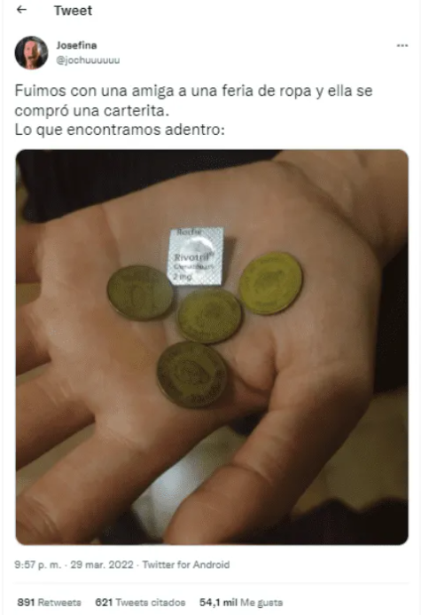 Una joven asistió a una feria de ropa con una amiga y en cuestión de horas se volvió viral gracias a lo que había dentro de la "carterita" que compraron. Las reacciones en la red social del pajarito llegaron en manada luego de que Josefina publicara una foto del prospecto de Rivotril que encontraron, el cual se encontraba junto con unas monedas de diez centavos.