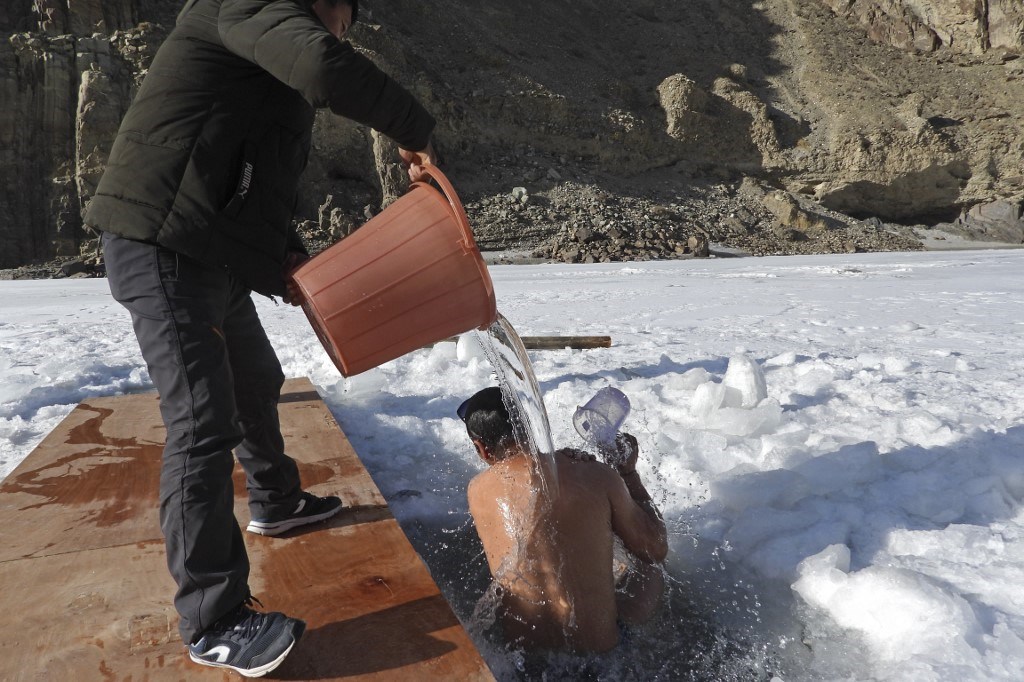 Los valientes que lo experimentan dejan el recinto, vestidos con una simple salida de baño, antes de abandonarla a orillas del río Zanskar para sumergirse, a través de una zanja, en las aguas heladas.