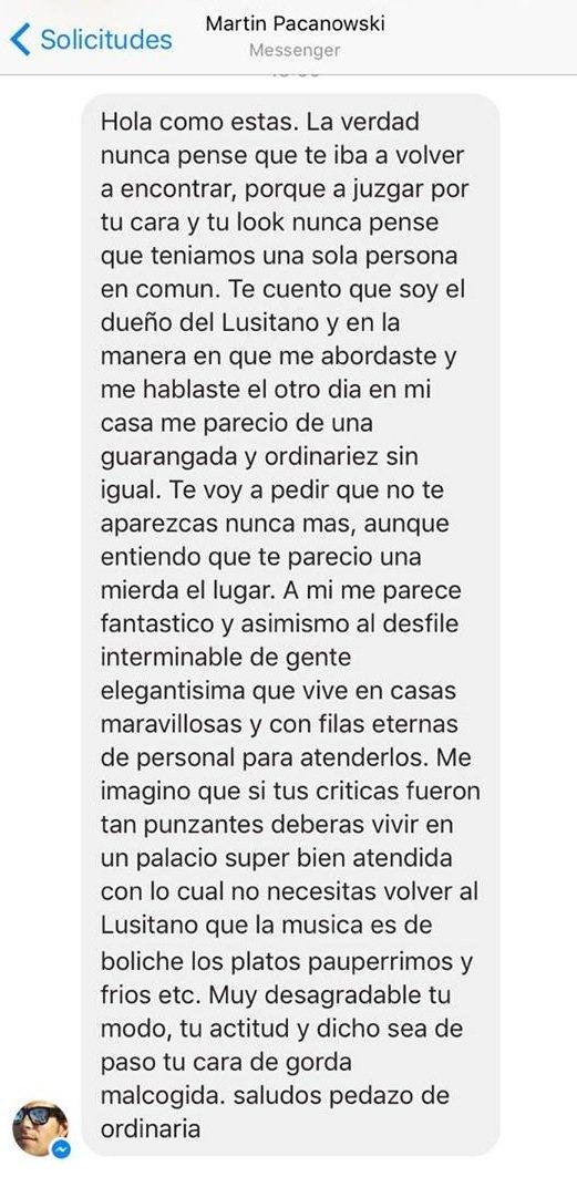 "La manera en que me abordaste y me hablaste el otro día me pareció de una guarangada y una ordinariez sin igual. No necesitás volver al Lusitano, ya que la música es de boliche, los platos fríos, paupérrimos, etc.", le escribió Martín Pacanowski
