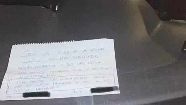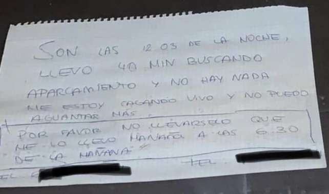 “Son las 12:03 de la noche, llevo 40 minutos buscando estacionamiento y no hay nada. Me estoy cagando vivo y no puedo aguantar más. Por favor no llevárselo que me lo llevo mañana a las 6.30 de la mañana”, detallaba explícitamente la nota.