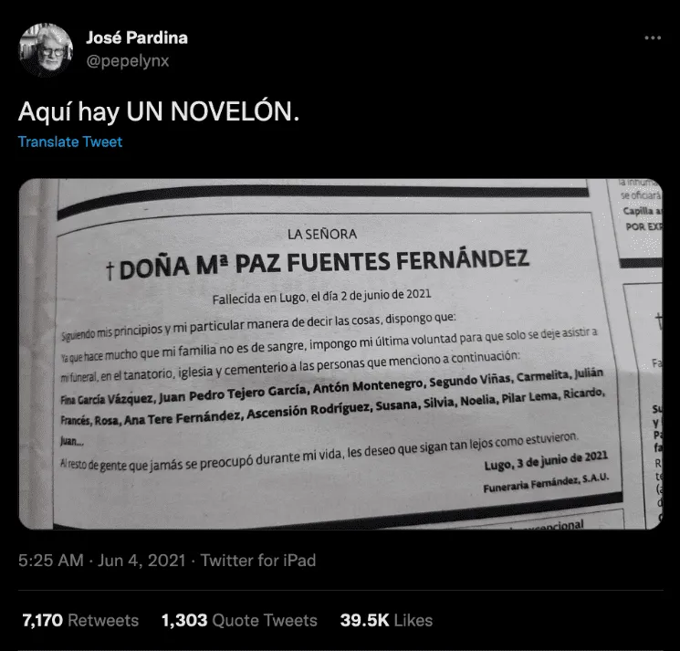 La carta se convirtió en viral en Twitter, luego de que el periodista madrileño José Pardina (@pepelynx), publicara en su cuenta el particular escrito, junto con el que escribió: "Aquí hay un novelón".