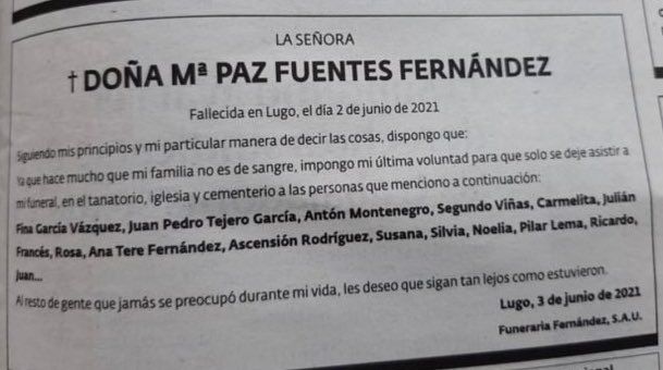 M. Paz Fuentes Fernández, la mujer que murió el pasado 2 de junio en Lugo, decidió innovar en este formato de avisos fúnebres y escribió: “Siguiendo mis principios y mi particular manera de decir las cosas, dispongo que: Ya que hace mucho que mi familia no es de sangre, impongo que mi última voluntad para que solo se deje asistir a mi funeral, en el tanatorio, iglesia y cementerio, a las personas que menciono a continuación”.