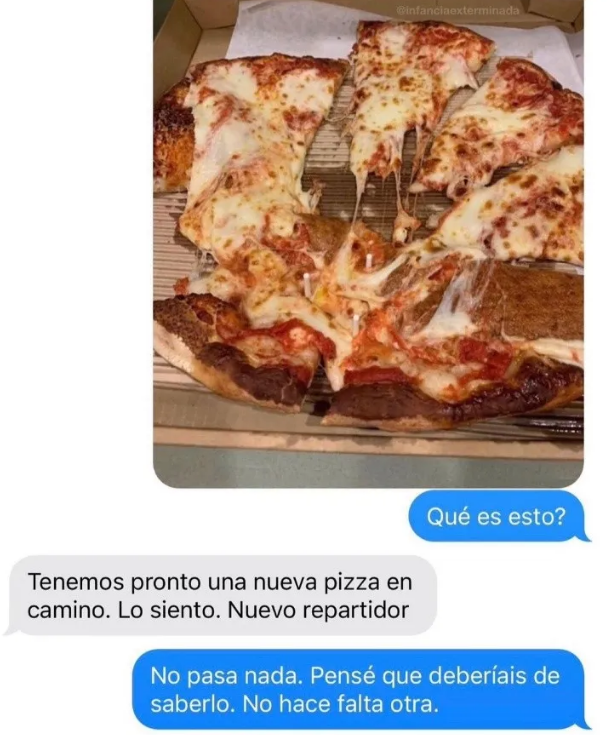 Al realizar el reclamo al sitio, los dueños del establecimiento ofrecieron llevar una nueva pizza al domicilio y sus disculpas porque “el delivery era nuevo”. Además, sostuvieron que harían que “el responsable de lo ocurrido, lo arregle” y que era “lo mejor porque se acordarían de no volver a hacerlo si tienen que entregarlo de nuevo".