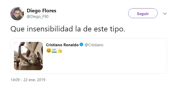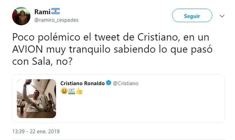 Cristiano Ronaldo publicó una inoportuna foto que generó un importante repudio en las redes sociales. El futbolista de la Juventus de Italia compartió una imagen suya a bordo de su lujoso avión y recibió muchas críticas por su falta de sensibilidad en torno a la incertidumbre mundial por la desaparición del avión que trasladaba a Emiliano Sala hacia Cardiff.