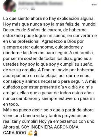 "Soy la más feliz del mundo. Después de 5 años de carrera, de haberme esforzado, pude lograr mi sueño de convertirme en una profesional", escribió en Facebook y le agradeció a Dios, a su familia, a su novio y a sus amigas". "A partir de ahora viene una buena vida y tantos proyectos por realizar y cumplir. Ahora si, soy Ingeniera Agrónoma carajo", cerró.