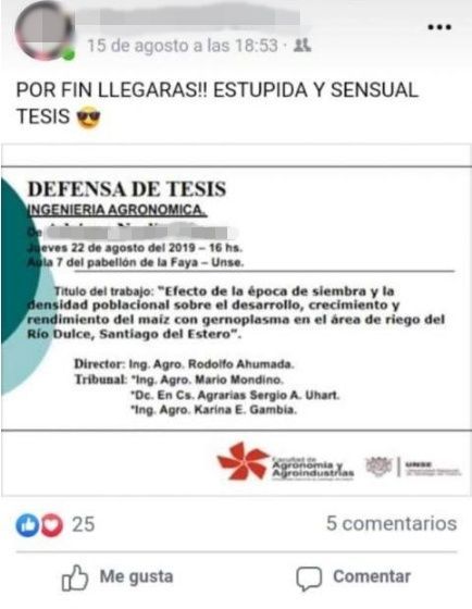 Así lo festejó una familia de Santiago del Estero hace algunas semanas cuando Adriana Noelia Gómez dijo que se recibía de Ingeniera Agrónoma. Pero hubo un giro inesperado para la familia cuando la Facultad de Agronomía y Agroindustrias de la Universidad Nacional de Santiago del Estero (UNSE) emitió un comunicado negando el título.