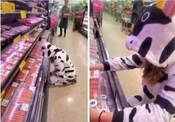 Una manifestante vegana se transformó en furor en las redes sociales luego de difundir un video suyo en el que se la ve disfraza de vaca llorando frente a la sección de carnes, en un popular supermercado australiano.