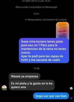 Luego, la mamá de la niña fue por más: "El luchón de Luciano tiene para Maratea y las deudas de Independiente pero no para la manutención de hija o las zapatillas, bien", dijo y compartió la charla que tuvo con el padre.