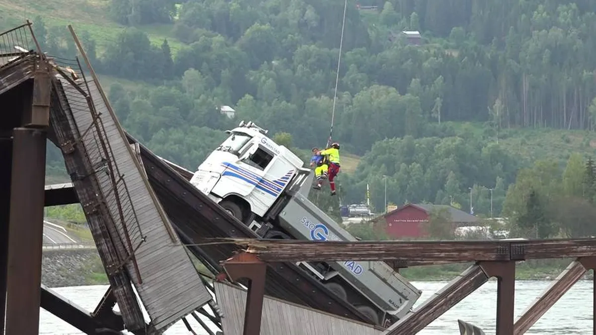 El colapso de un puente de madera en Noruega ocasionó que un automóvil se hundiera en el río Laagen y que un camión quedara atascado casi en posición vertical en una abertura.
