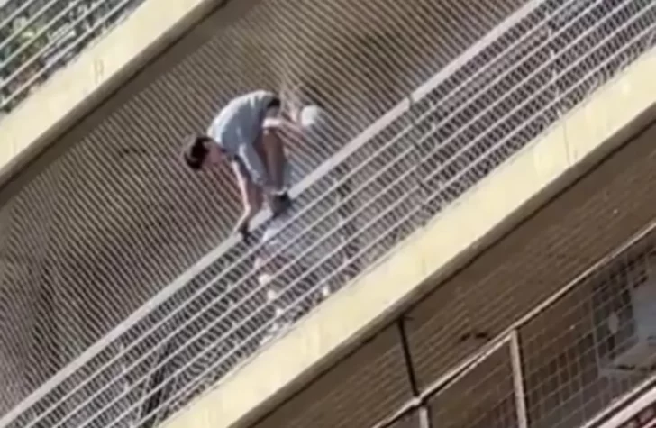En las filmaciones se ve a un menor sujetándose a la malla de protección ubicada en uno de los balcones más altos del edificio. De acuerdo a la información consignada en medios locales, se trata de un chico de 11 años que padece autismo y que había logrado romper la red, quedando atrapado del otro lado de la misma con alto riesgo de caer al vacío.