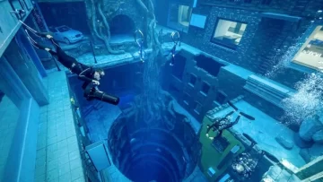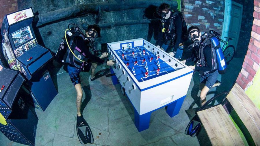 Obviamente, lo más interesante de Deep Dive es ir hasta el fondo, donde los buceadores se encontrarán con una curiosa ciudad sumergida, en la que podrán tomarse hilarantes fotos, como andando en una bicicleta fija o jugando en un metegol con amigos.