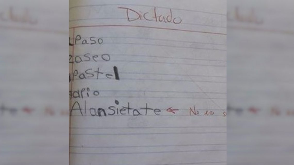 Según ve en la publicación, las palabras que dictó el profesor fueron: paseo, aseo, pastel, apio y "Alan siéntate" (sic). Evidentemente, el compañerito se portó mal durante la evaluación y el docente lo retó. Nunca se imaginó que otro alumno lo iba a tomar como parte del dictado.