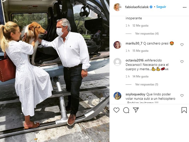 Todo comenzó cuando en su cuenta de Instagram @fabiolaoficialok, la primera dama subió una fotografía en la que se la veía junto al presidente Alberto Fernández y a su perro Dylan en los instantes previos a abordar el helicóptero.