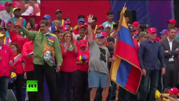 Maradona fue la atracción principal en el show previo al discurso del mandatario, en el que salió ondeando una bandera venezolana y bailando, causando la euforia de la multitud reunida para el acto.  Junto al astro de fútbol había otras personalidades y artistas que visitan periódicamente Venezuela para expresar su respaldo al gobierno chavista.