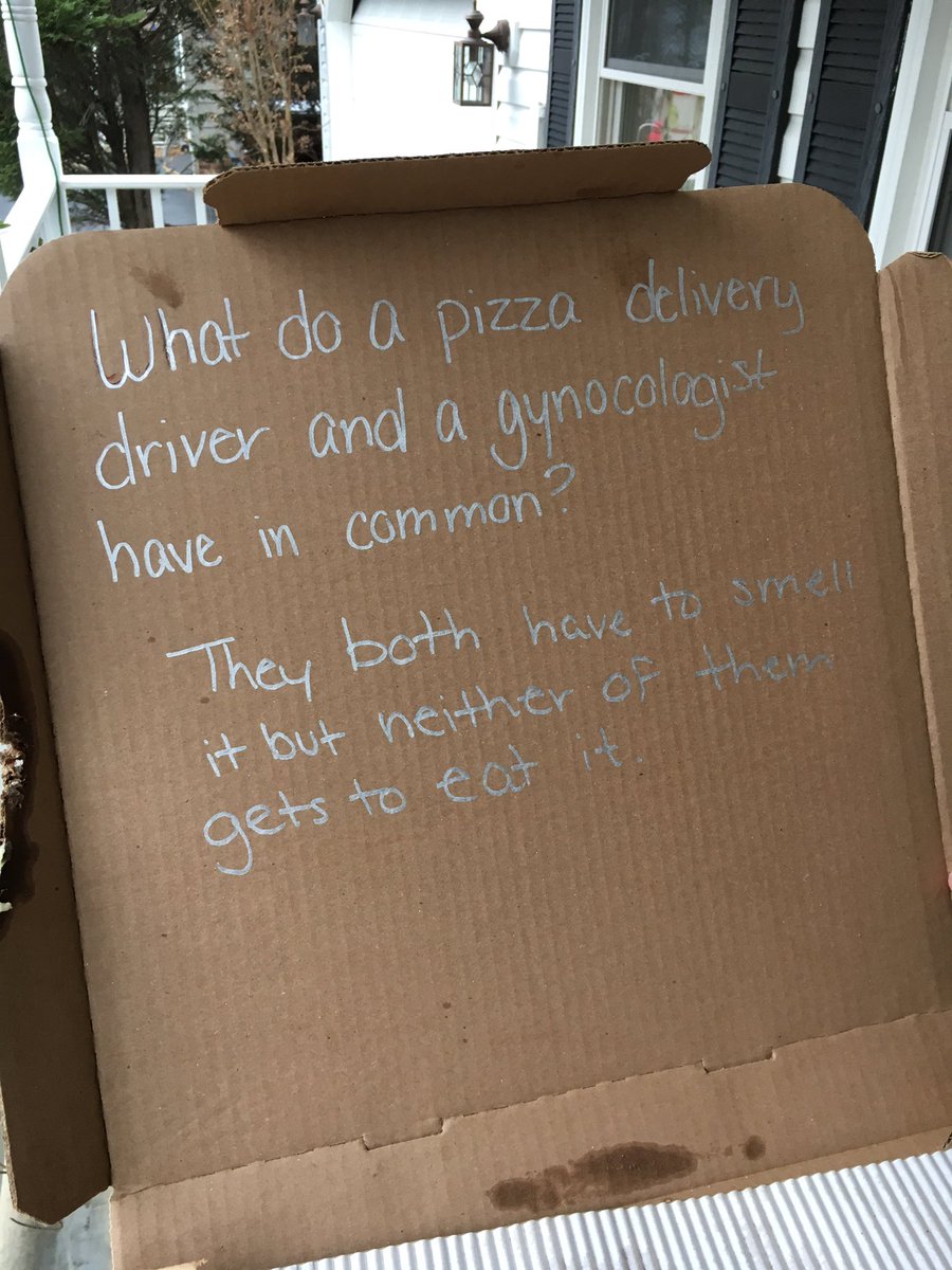 “¿Qué tienen en común un repartidor de pizza y un ginecólogo?”, escribió en el interior de la tapa de la caja. Y la respuesta: “Ambos tienen que olerla, pero ninguno de los dos puede comérsela”.
