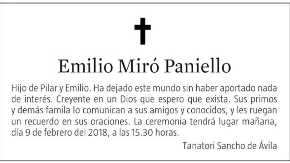 “Hijo de Pilar y Emilio. Deja este mundo sin haber aportado nada de interés. Creyente en un Dios que espero que exista. Sus primos y demás familia lo comunican a sus amigos y conocidos, y les ruegan un recuerdo en sus oraciones”, decía el texto que se públicó el último jueves para despedir a Emilio Miró Paniello, un hombre de 77 años que falleció el último martes en Barcelona.