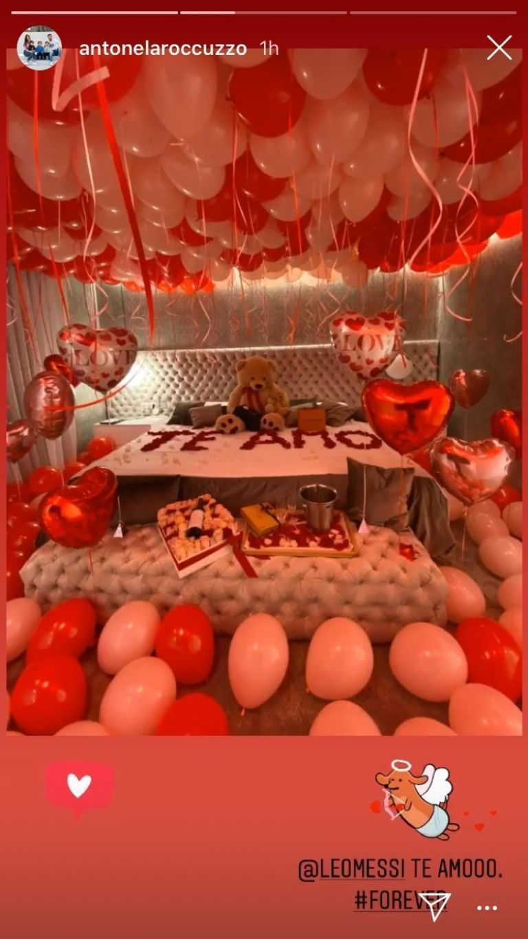 Pero como si esto fuera poco, Messi escribió "Te amo" con pétalos de rosa sobre la cama y sirvió dos copas de champagne junto a unos bombones de chocolate para celebrar con la madre de sus tres hijos.