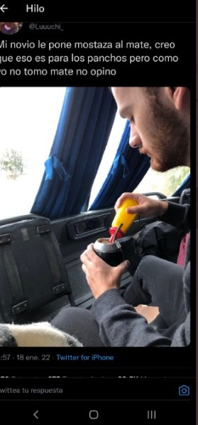 Todo inició luego de que una joven quiso mostrar un gusto particular que tenía su novio al momento de tomar el mate. Ella pensó que a él le gustaba el mate con mostaza. "Mi novio le pone mostaza al mate. Creo que eso es para los panchos, pero como no tomo mate, no opino", expresó el tuit la usuaria @Luuuchi_ .
