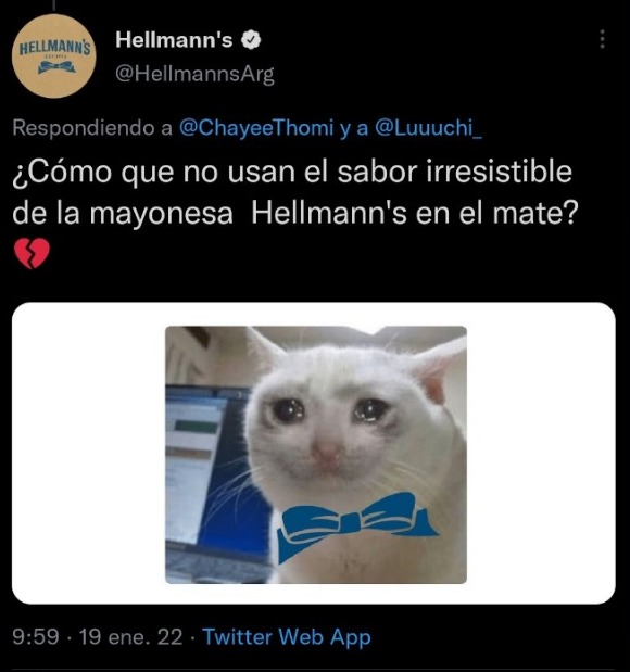 En este contexto, apareció el CM de "Hellmann`s", quien terminó dejando un meme para cerrar un viral que mostró el ingenio de algunos de los profesionales a cargo de las cuentas en redes sociales de las marcas. "¿Cómo que no usan el sabor irresistible de la mayonesa Hellmann’s en el mate?", comentó la cuenta de la mayonesa.