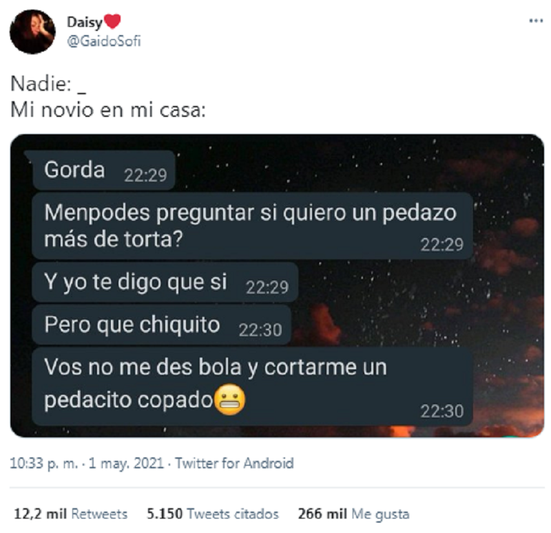 La historia se hizo viral en redes sociales debido a que una usuaria compartió el momento en su cuenta de Twitter. “Nadie… Mi novio comiendo en casa“, escribió la joven junto a una captura de pantalla en la que se leía un chat de WhatsApp con su novio. En éste, él le detallaba paso a paso su plan para que pueda comer otra porción.