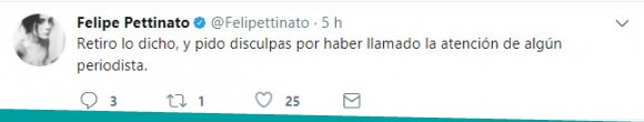 Sin embargo, y ante la gran repercusión que generó el posteo entre sus casi 90 mil seguidores, Felipe decidió eliminar el mensaje y pedir perdón públicamente: "Retiro lo dicho, y pido disculpas por haber llamado la atención de algún periodista".