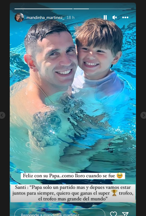 La historia fue contada por la esposa de Martínez, Mandinha, quien puso en sus historias de Instagram una foto del jugador abrazado con Santiago y comentó: “Feliz con su papá, como lloró cuando se fue”.