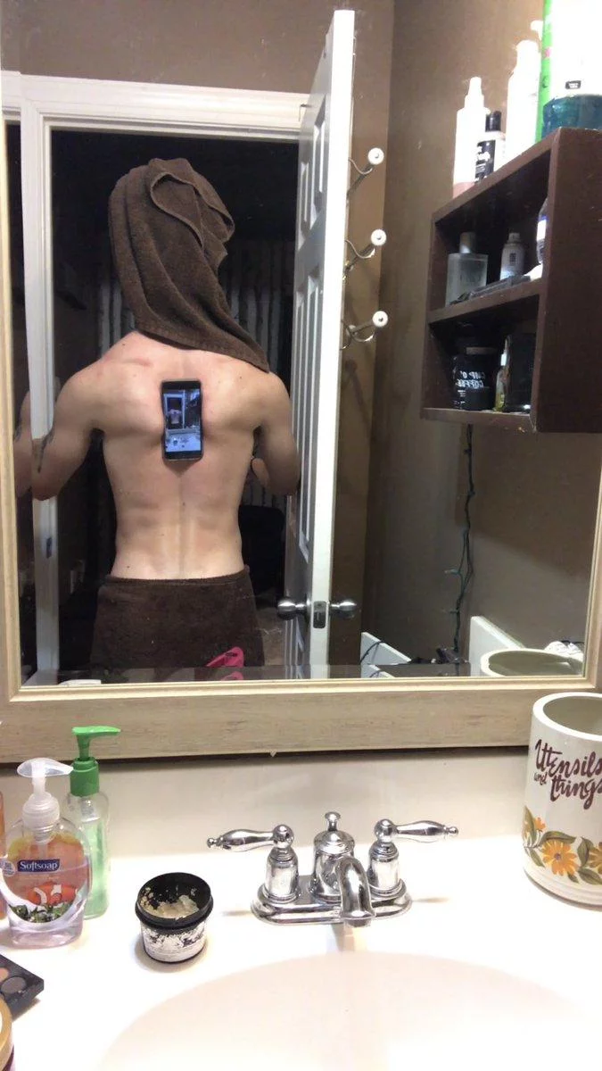 ¿Pero qué es lo que me molesta? Si miramos la imagen en detalle vemos a un joven, con una toalla en la cintura y otra en la cabeza, logrando algo que no muchos podríamos hacer: sostener el teléfono con la espalda -los omóplatos, para ser precisos- y sacarse una selfie (¿invertida? ¿selfieomóplato?).