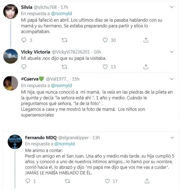 "Mi padre falleció hace 2 años, su casa aún deshabitada, conserva el sillón dónde pasó sus últimos días. La beba de 2 años de mi sobrina quiere entrar a la casa la acompaña su madre, la nena dice: mamá, el señor que está sentado ahí no es malo" reveló el escalofriante tuit de @normyld y acto seguido miles y miles de comentarios reflejaron escalofriantes casos.