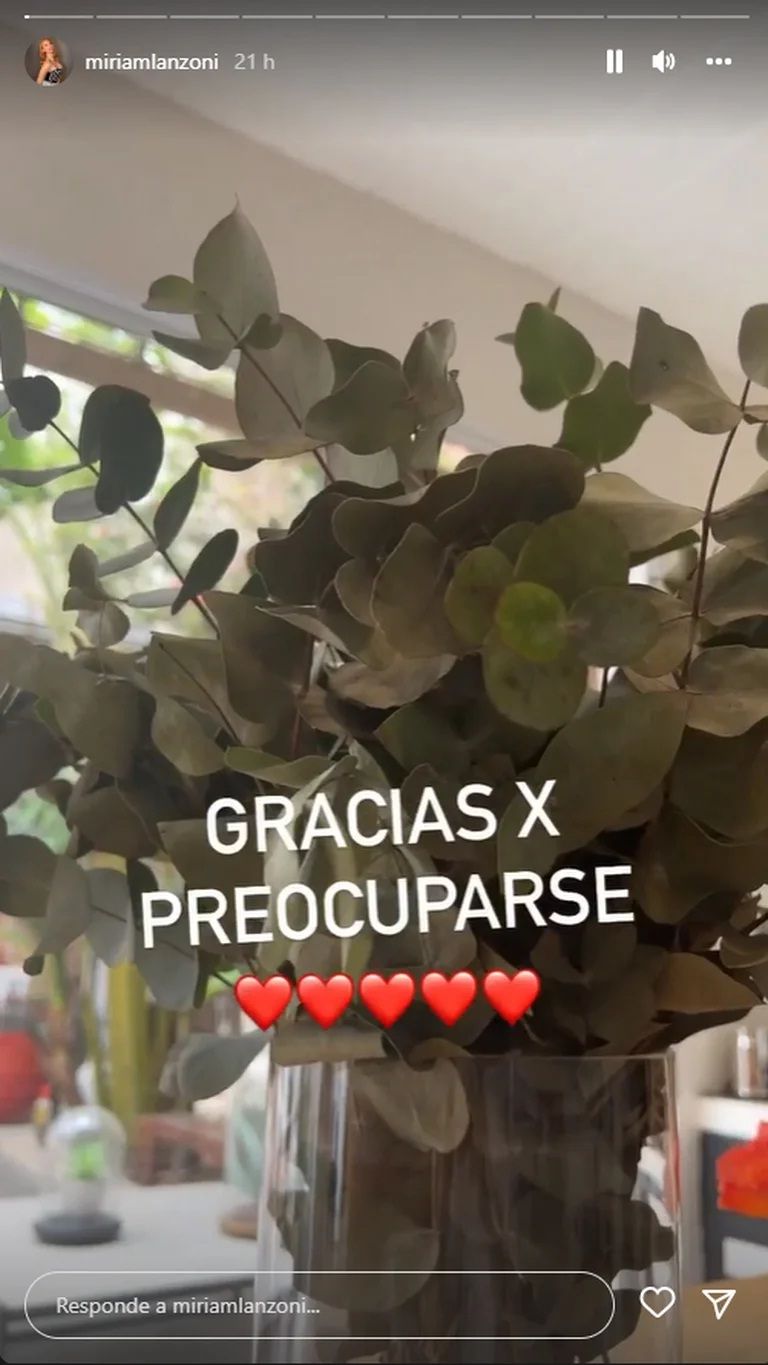 A través de sus stories, Miriam expresó su gratitud hacia todos los que le enviaron buenas energías y le preguntaron cómo se encuentra. Con actitud positiva y un poco de humor, enfocó uno de sus floreros y habló detrás de cámara: “El plano es del eucalipto porque mi cara está lastimada por mi gatito, como mucha gente sabe; justamente les quiero agradecer por tantos mensajitos para saber cómo estoy”.