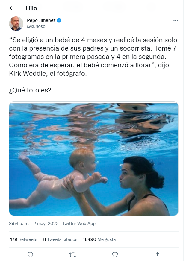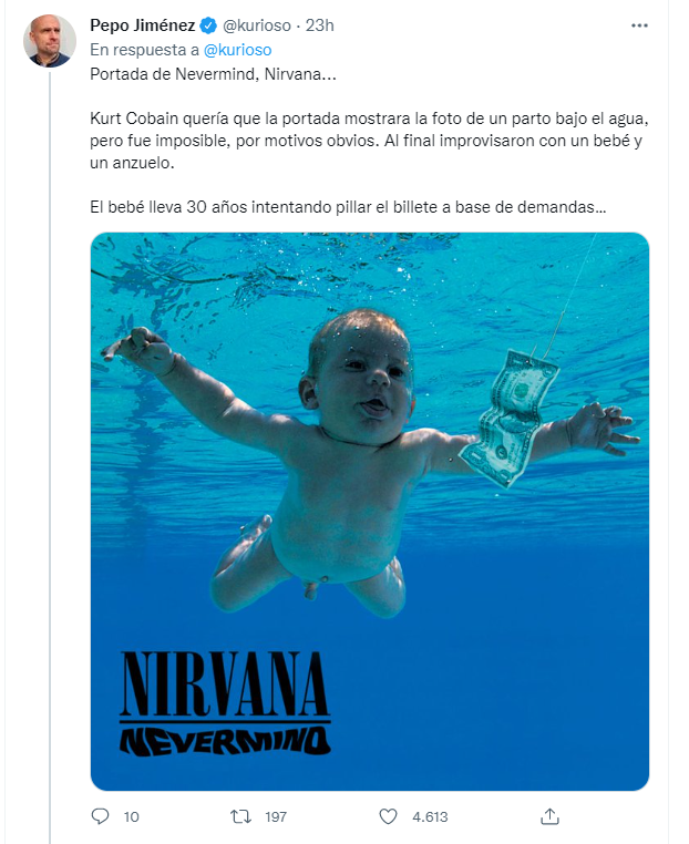 Siguiendo esa línea, @kurioso también puso como ejemplo a otra banda de música muy conocida, Nirvana. La portada de su disco “Nevermind” sacudió al mundo, porque figura un bebé nadando desnudo frente a un billete de un dólar tirado.