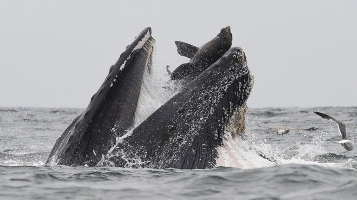 Una de esas ballenas se elevó por encima del agua con la boca abierta y en el camino se llevó a uno de los lobos marinos. Ese instante quedó retratado por la cámara de Chase. "Fue un evento único en la vida", dijo a Radio 1 Newsbeat. Y el propio Chase se encargó de contar cómo siguió la historia.