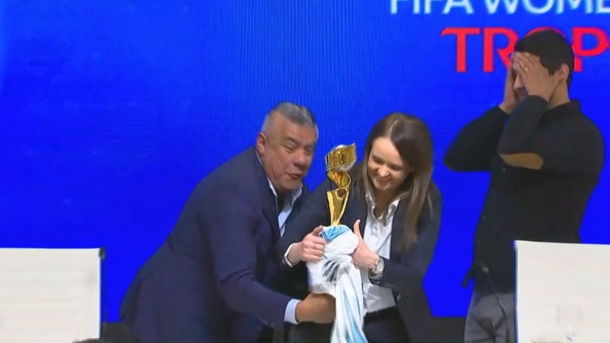 Al finalizar el evento casi se le cae la Copa y además la tocó, derecho exclusivo de los campeones mundiales. Todo esto ante los ojos de Sara Booth, Directora del Departamento de Competiciones Femeninas de FIFA, y Veronica Boquete, leyenda y ex jugadora de la Selección de España, que intentaron subsanar el error del dirigente argentino.