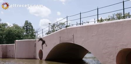 En el segundo cuadro se ve cómo cae de frente al agua.