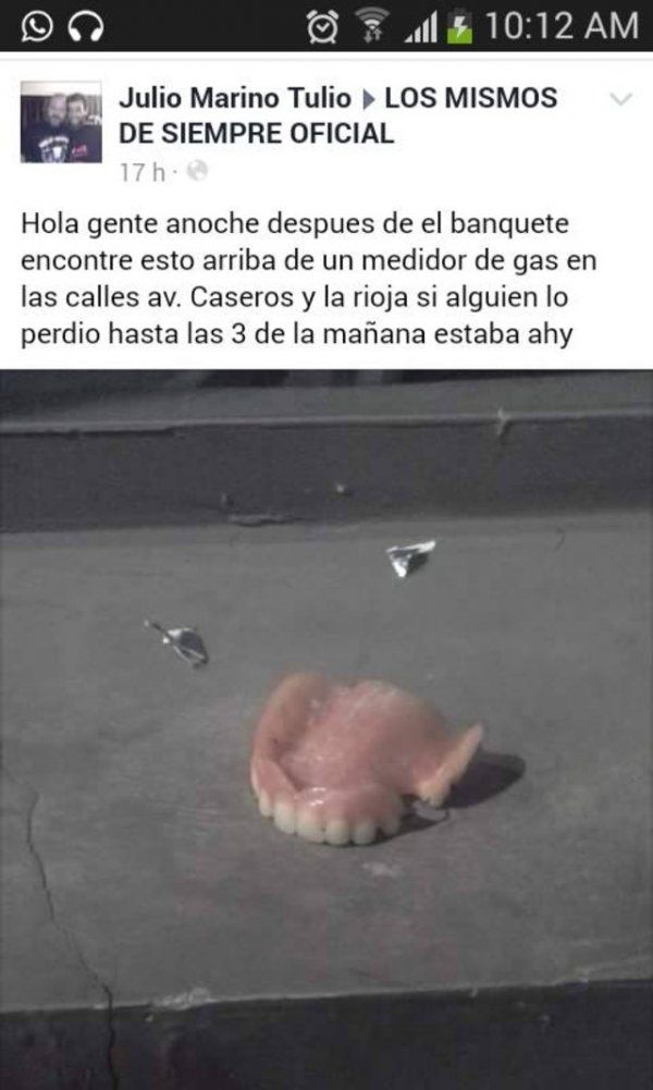 En uno de los grupos de los seguidores de La Renga en Facebook un fan publicó una fotografía que llamó la atención. Se trata de una extraña dentadura que encontró sobre un medidor de gas en las calles Caseros y La Rioja, cerca del estadio de Huracán luego de finalizado el show.