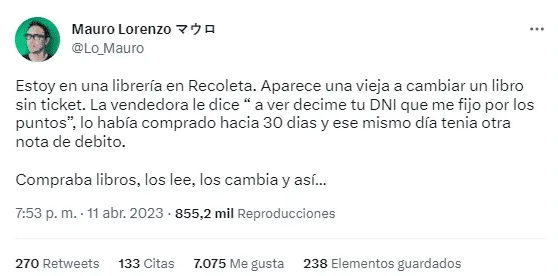 “Estoy en una librería en Recoleta. Aparece una vieja a cambiar un libro sin ticket. La vendedora le dice “a ver, decime tu DNI que me fijo por los puntos”. Lo había comprado hacía 30 días y ese mismo día tenía otra nota de débito. Compraba libros, los lee, los cambia y así…”, remarcó el usuario "Lo_Mauro".