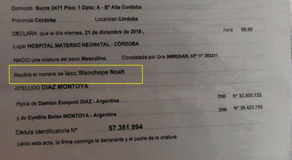 De ese modo, el niño en cuestión se llama Iacc Wanchope Noah Díaz Montoya, quien fue anotado por sus papás Damián y Belén el pasado miércoles 26 de diciembre.