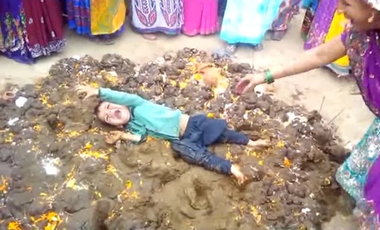 Una vez al año, lo niños pequeños son lanzados y refregados sobre una montaña de estiércol de vaca. Según la creencia local, ese rito les hará tener una vida saludable sin enfermedades y les traerá suerte a los pequeños.