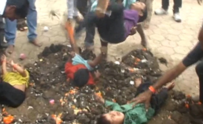 Durante semanas, los habitantes de Betul colectaron el estiércol en algunos montículos. Este domingo, luego de rezar a los dioses hindúes, los padres llevaron a los niños a partir del año de edad a lanzarlos sobre la montaña. La actividad continuó durante todo el día, hasta que todos los niños del pueblo pasaron por el curioso ritual.