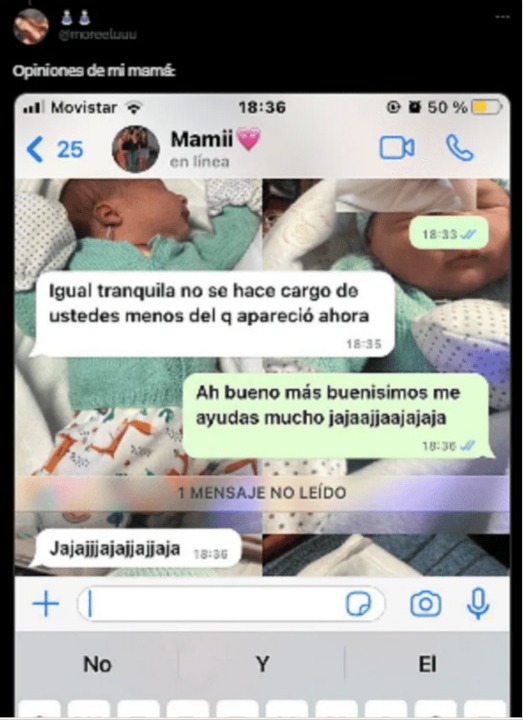 La joven autora del tuit se quedó sin palabras, pero alcanzó a compartir con sus seguidores la palabra más esperada acerca de la situación que era la de su mamá. Fue así que en otro tuit en el cual escribió “Las opiniones de mi madre”, la joven volvió a publicar otra captura de pantalla, esta vez de un chat privado entre ella y su madre. “Igual tranquila, no se hace cargo de ustedes menos del que apareció ahora.”, señaló la madre de la joven en referencia al nuevo hermano descubierto de la autora del tuit.
