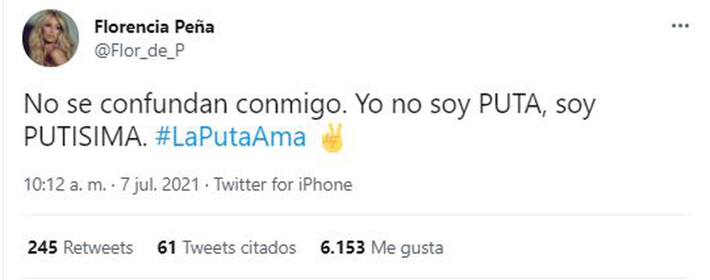 Ambos tuits tuvieron mucha repercusión, lo que generó una catarata de comentarios buena onda y también aparecieron mensajes desubicados que despertaron el malestar de la actriz. Para esos desubicados, minutos más tarde llegó la respuesta: “No se confundan conmigo. Yo no soy pu…, soy pu…sima.”, señaló. Inmediatamente, recibió el respaldo de muchos de sus seguidores.