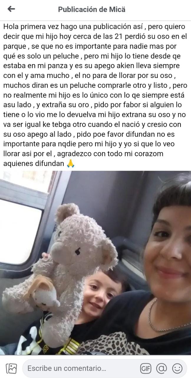 Y agregó: "Mi hijo es chiquito y llora desconsolado. Es que él tiene ese oso desde que estaba en mi panza y es hijo único, entonces hace todo con el peluche, duerme, le da comer, lo lleva cada vez que salimos, es su elemento de apego. Cualquiera podría decirme que le compre otro, pero no es lo mismo. Él lo ama".
