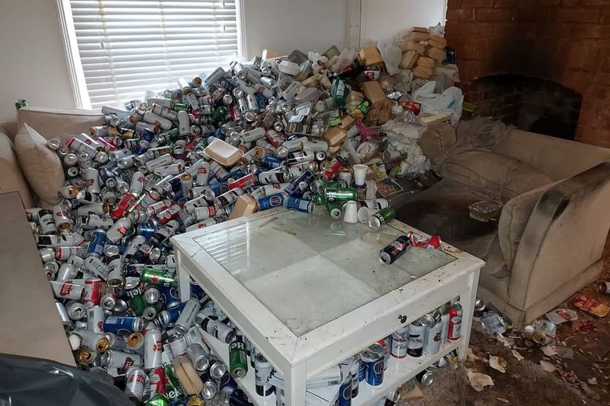 Freddie Gillium-Webb, un limpiador profesional, mostró las imágenes del extremo desorden que encontró al ingresar a la propiedad. Había más de 8000 latas de cerveza acumuladas por los rincones, comida podrida y un inodoro lleno de residuos.
