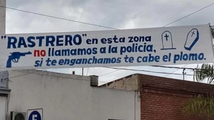 Vecinos del barrio Escalante, en el norte del macrocentro de la capital santafesina, colocaron un pasacalles con una advertencia para los delincuentes: "Rastrero: en esta zona no llamamos a la policía; si te enganchamos te cabe el plomo", señala el texto en la tela, acompañado de dibujos de un ataúd, una lápida y un arma de fuego.