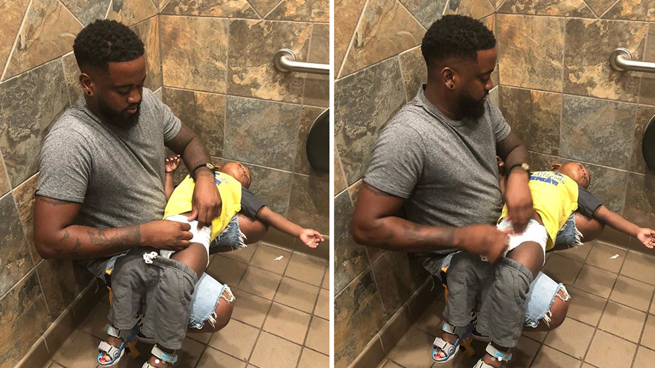 "¡Esto es un post serio!! ¿Por qué no hay cambiadores para bebés en el baño de hombres?", escribió Donte Palmer en su cuenta de Instagram, y siguió: "Obviamente hacemos esto a menudo para que mi hijo se sienta más cómodo, ¡es lo habitual para él! ¡Solucionemos esto!".