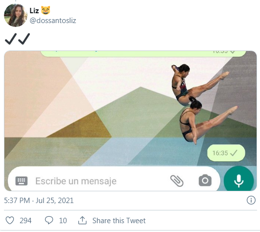 En la imagen aparecen ambas deportistas realizando su ejercicio justo en el momento en que están cayendo al agua. El usuario ha escrito junto a esa instantánea: “Cuando me clavan el visto olímpicamente”.