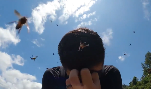 Mientras tanto, Dan, quien sostenía la cámara con la que grababan el video, le insistió para que no corriera porque sino la comenzarían a perseguir. Por eso, decidió quedarse quieto, agachado en cuclillas, mientras llegaban más y más abejas a rodearlo. “Me están picando, no corras”, gritó.