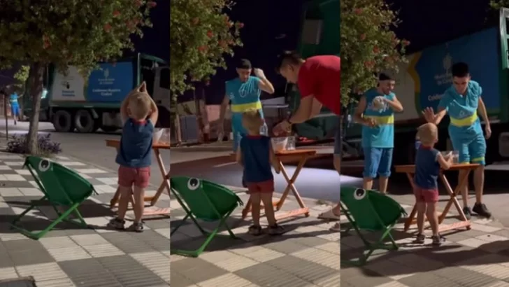 Con una mesa de madera, una silla, una gaseosa y una botella de agua con hielo, el nene esperaba ansioso la llegada de los basureros, quienes “todas las noches lo alegran tocándole bocina y gritándole: ‘¡Chau amigo!’”. Según contó Lucas en su posteo, esta vez fueron ellos quienes decidieron alegrarles un poco la noche.