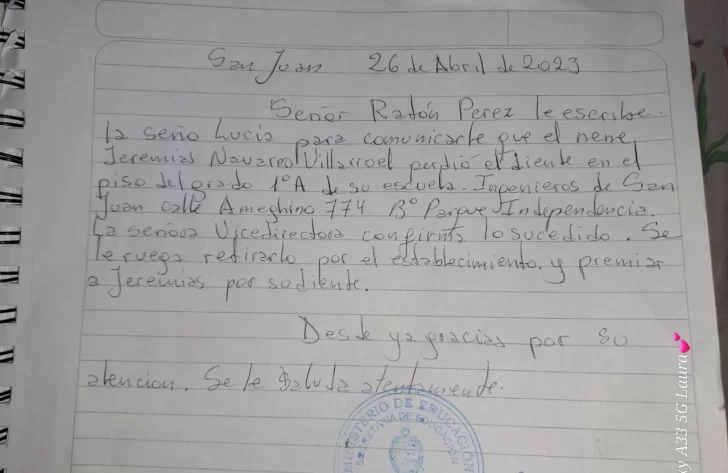 “Señor Ratón Pérez, le escribe la seño Lucía para comunicarle que el nene Jeremías Navarro Villarroel perdió el diente en el piso del grado 1° A de su escuela Ingenieros de San Juan, calle Ameghino 774 barrio Parque Independencia. La señora Vicedirectora confirma lo sucedido. Se le ruega retirarlo por el establecimiento y premiar a Jeremías por su diente”, reza la nota que lleva el sello de la escuela.